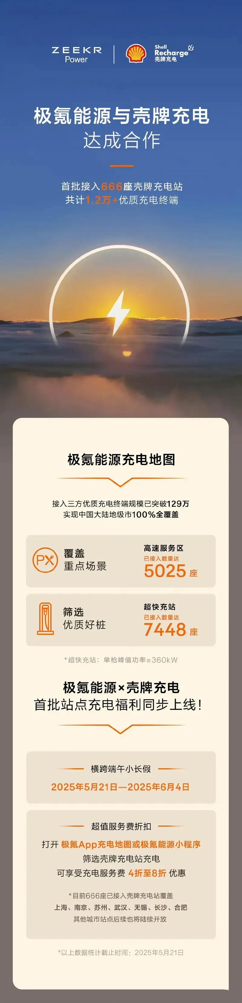 极氪能源与壳牌充电达成合作,据悉,极氪能源首批接入666座壳牌充电站,共计1.2万+优质充电终端。